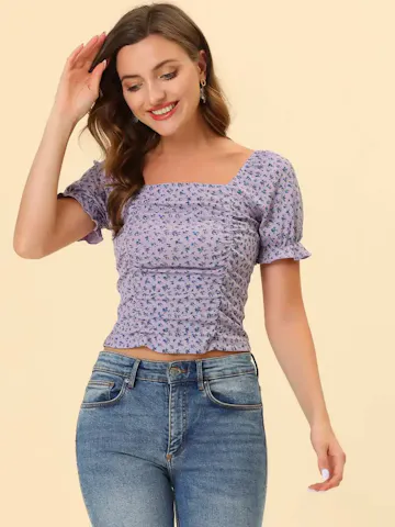 Trendy smocked crop top for women featuring slim fit, floral design, and peasant style—perfect for casual, chic, and feminine looks.