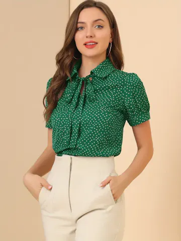 A chic women’s retro chiffon top with playful prints, doll collar, and bow tie detail—perfect for vintage-inspired elegant looks.